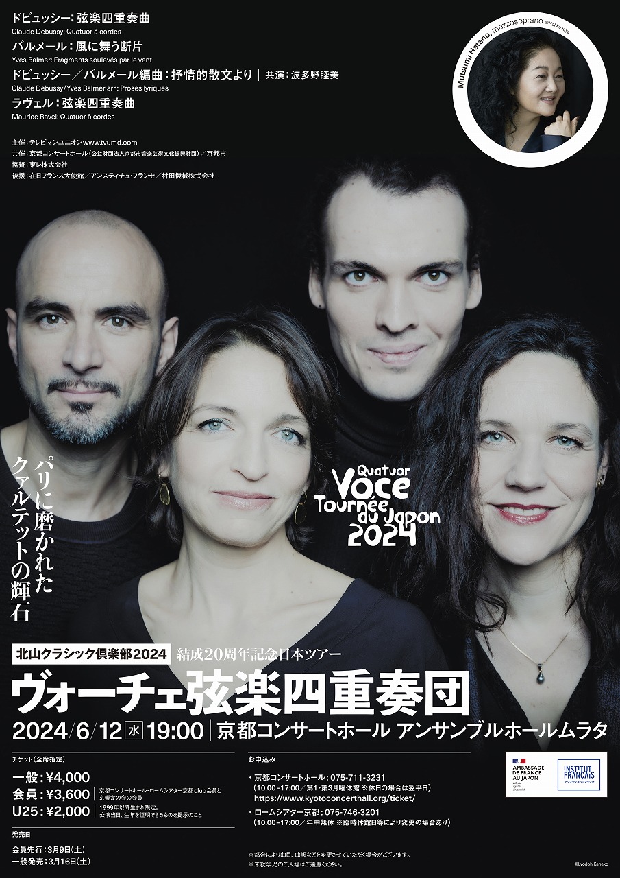 パリ国立高等音楽院で結成され20年目を迎えるヴォーチェ弦楽四重奏団。今回はパリ・オリンピックの前夜祭とも言うべき全フランス作品による“フレンチ・コレクション”です。国民的作曲家ドビュッシー、ラヴェルに加え、バルメールによる新作。さらに同氏編曲によるドビュッシーの抒情的散文にメゾ・ソプラノの波多野睦美をゲストに迎えて華やかにお送りします。どうぞご期待ください!