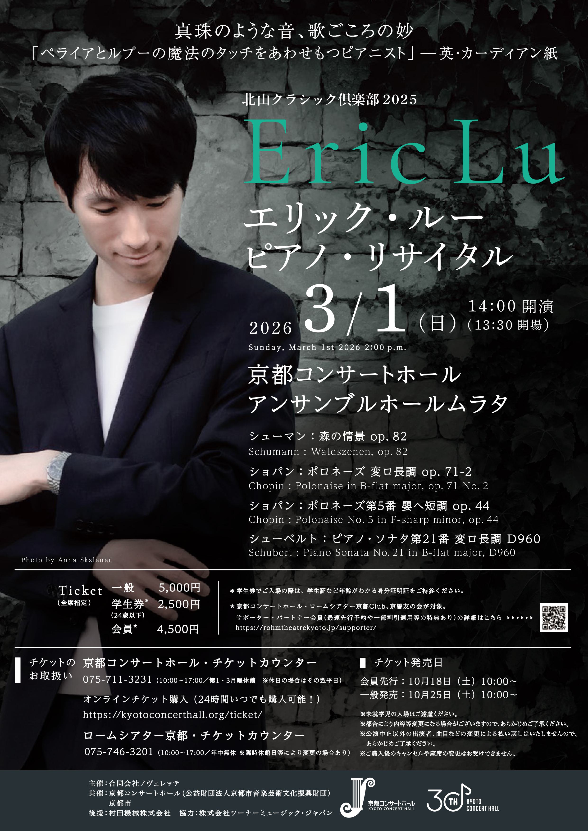 1997年アメリカ出身、2015年ショパン国際ピアノ・コンクールに当時わずか17歳で入賞し、国際的に注目されたエリック・ルー。20歳でリーズ国際ピアノ・コンクールに優勝した翌年、ワーナー・クラシックスと専属契約を結び、2021年にはエイヴリー・フィッシャー・キャリア・グラントを受賞しました。以来、リッカルド・ムーテイ指揮シカゴ交響楽団、マリン・オールソップ指揮ロンドン交響楽団など世界の一流の指揮者や、オーケストラとの共演を重ねるほか、世界各地の主要ホールでのリサイタルなど国際的な活動を続けています。本公演は、ルーがこよなく愛する2人の作曲家シューベルトとショパンに焦点をあて、晩年の傑作に想いをこめます。