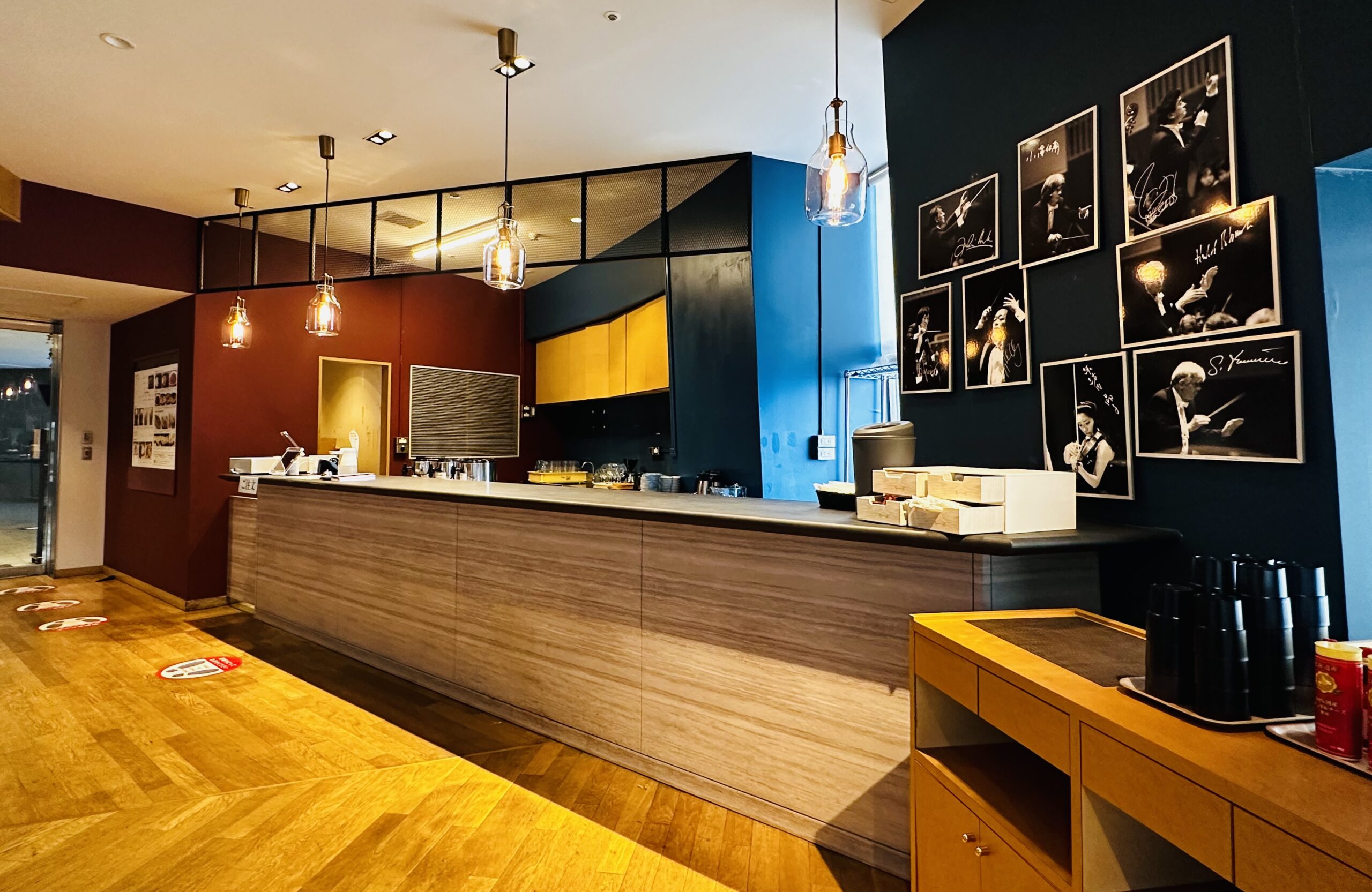 音楽が流れるゆったりと落ち着いた空間で、コンサートの待ち時間や余韻のひとときをお過ごしください。
