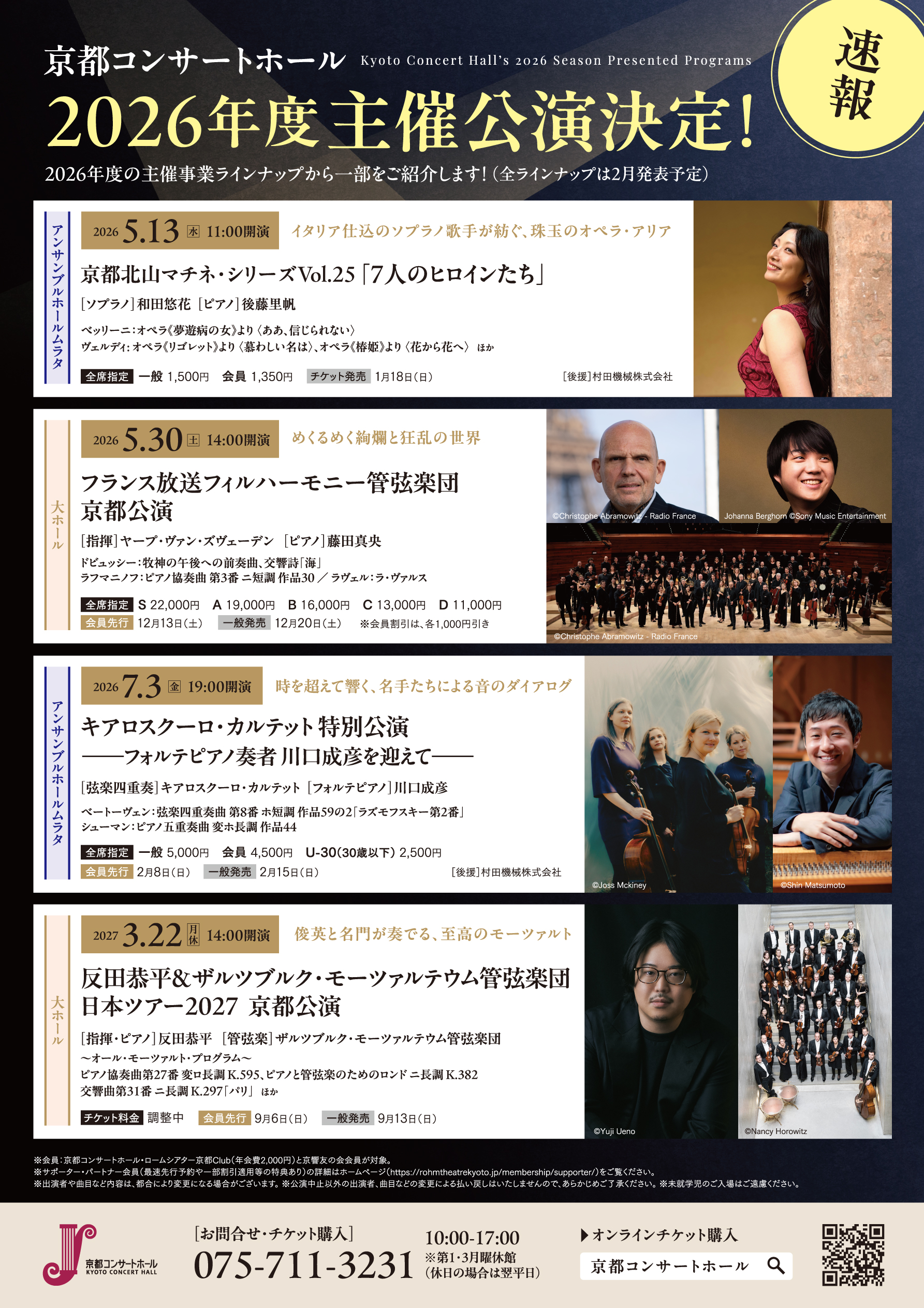 京都コンサートホール2026年度シーズン(2026年4月~2027年3月)の主催事業ラインナップから、速報で4公演を発表します!