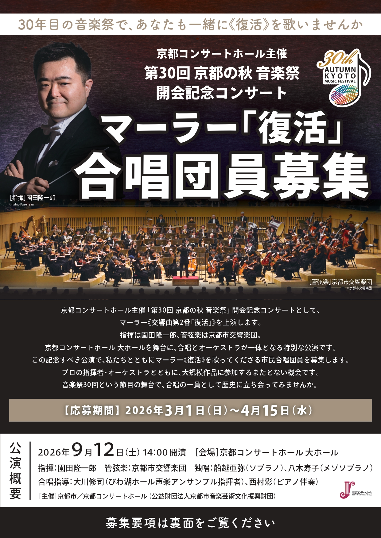 【重要・合唱団員募集に関する変更のお知らせ】第30回京都の秋 音楽祭 開会記念コンサート(2026年9月12日)
