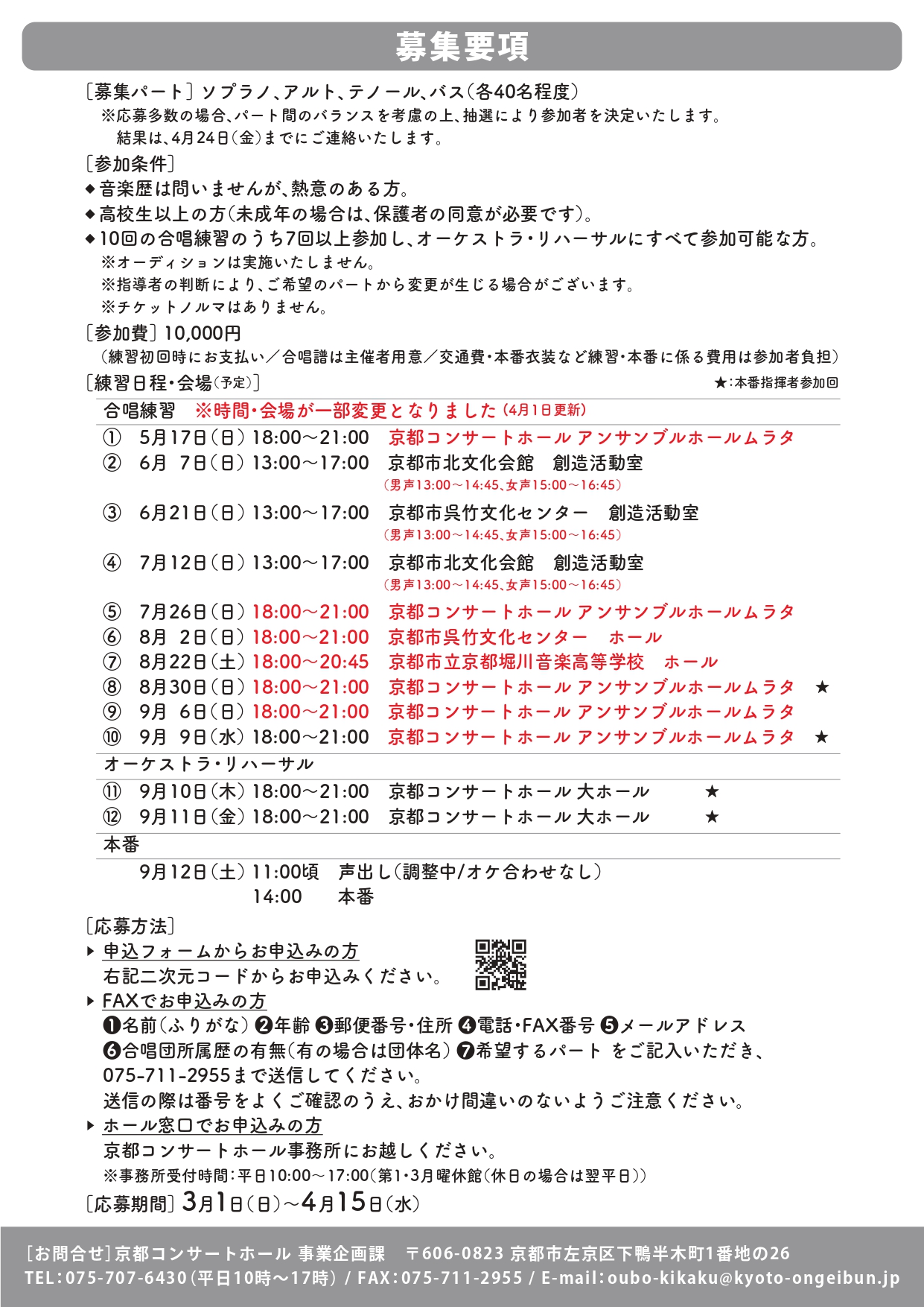 すでにご応募いただいている方で、今回の変更により、やむを得ず練習参加が難しくなる場合、お手数ですが必ず下記お問合せ先までご連絡ください。